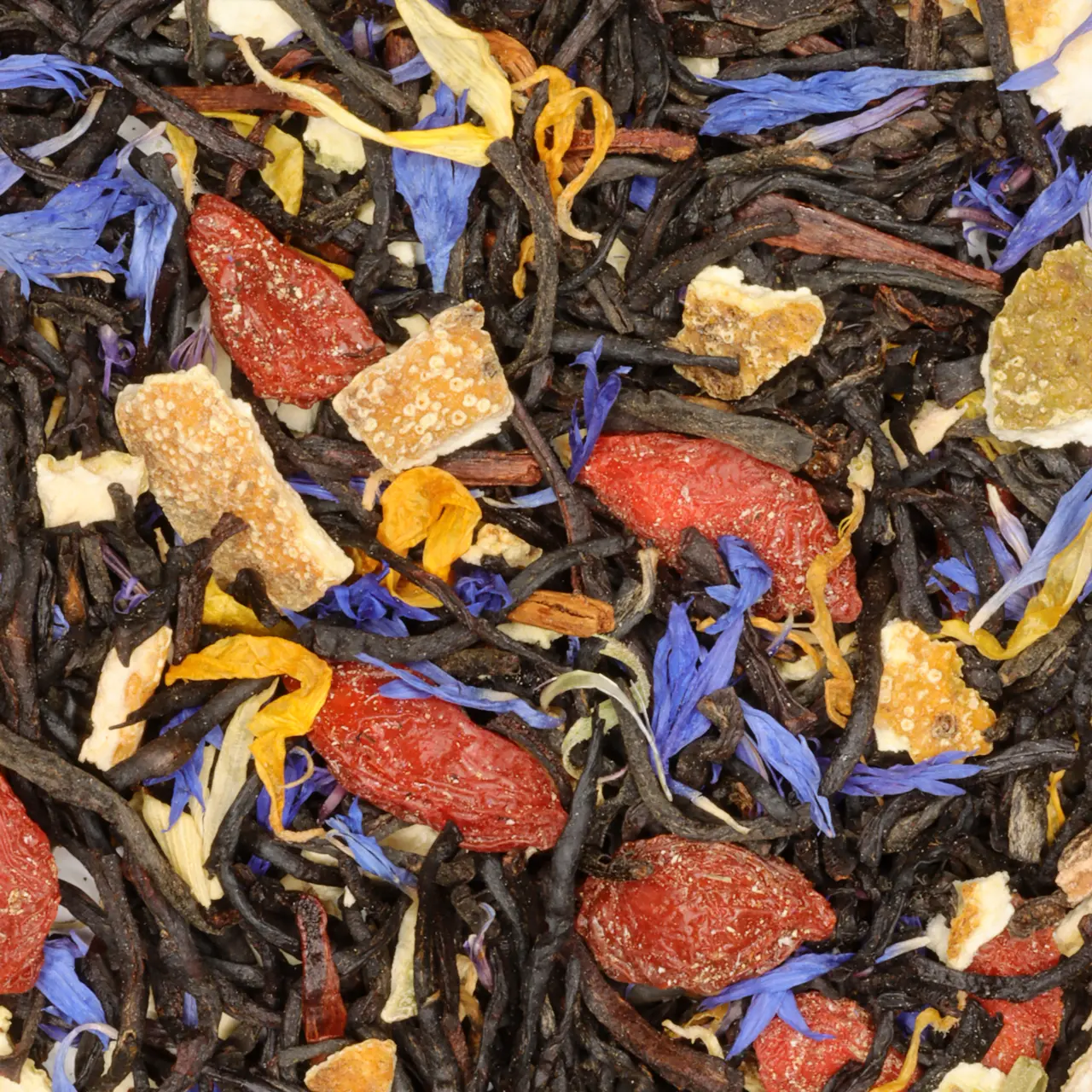 Ingrediënten: zwarte thee*, gojibessen*, sinaasappelschil*, korenbloem*, goudsbloem*, natuurlijke bergamot- en vanillearoma’s