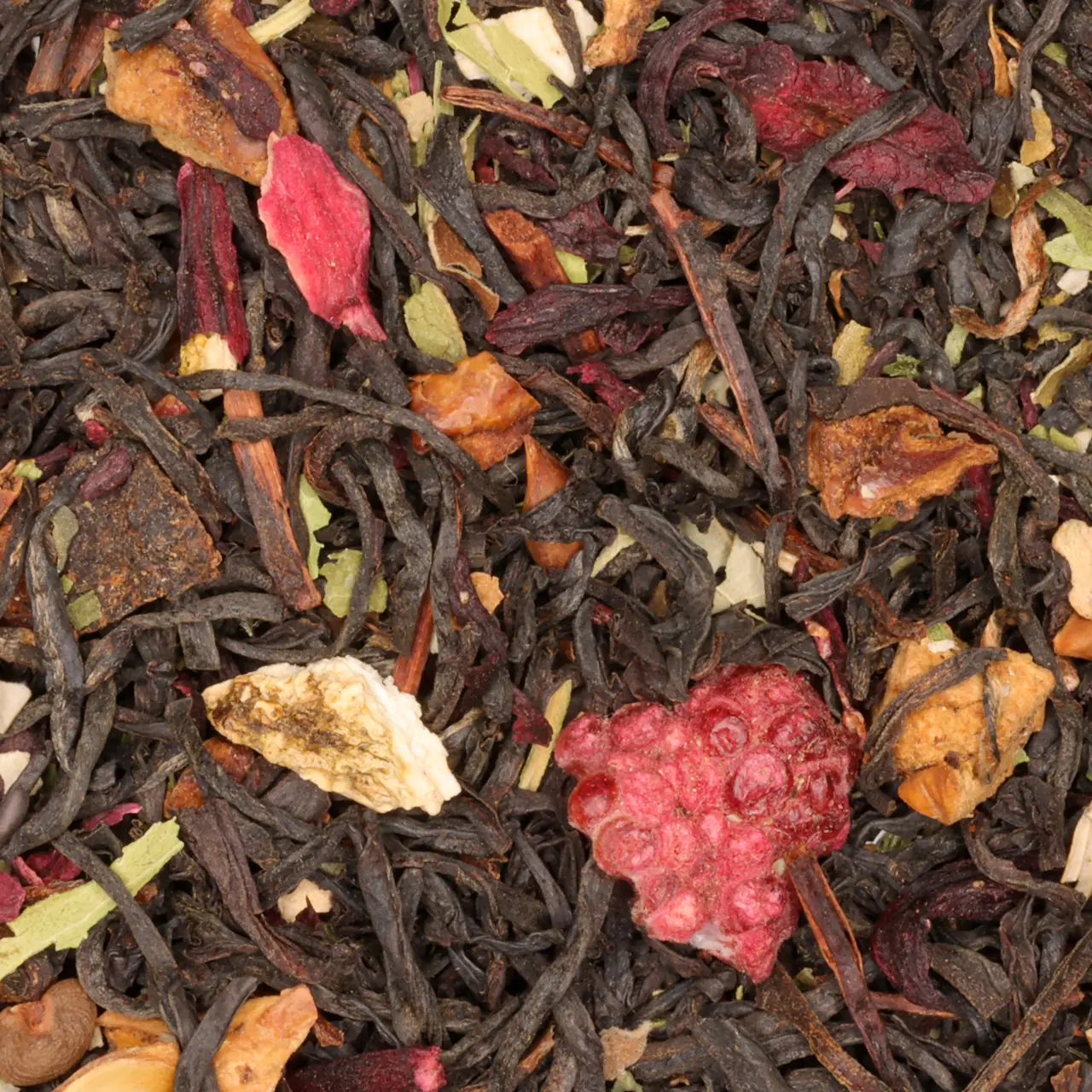 Ingrediënten: zwarte thee*, appel*, hibiscus*, sinaasappelschil*, bramenblad*, natuurlijk fruitaroma, stevia*, aardbeien*, frambozen*