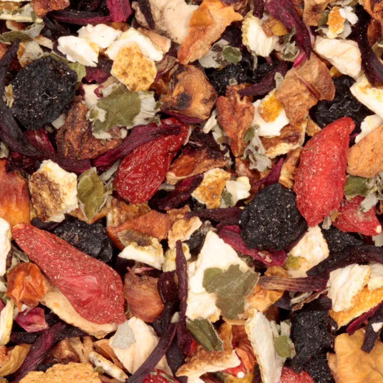 Ingrediënten: appel*, hibiscus*, sinaasappelschil*, gojibessen*, aroniabessen*, bramenblad*, natuurlijk fruitaroma, aardbeien*, frambozen*