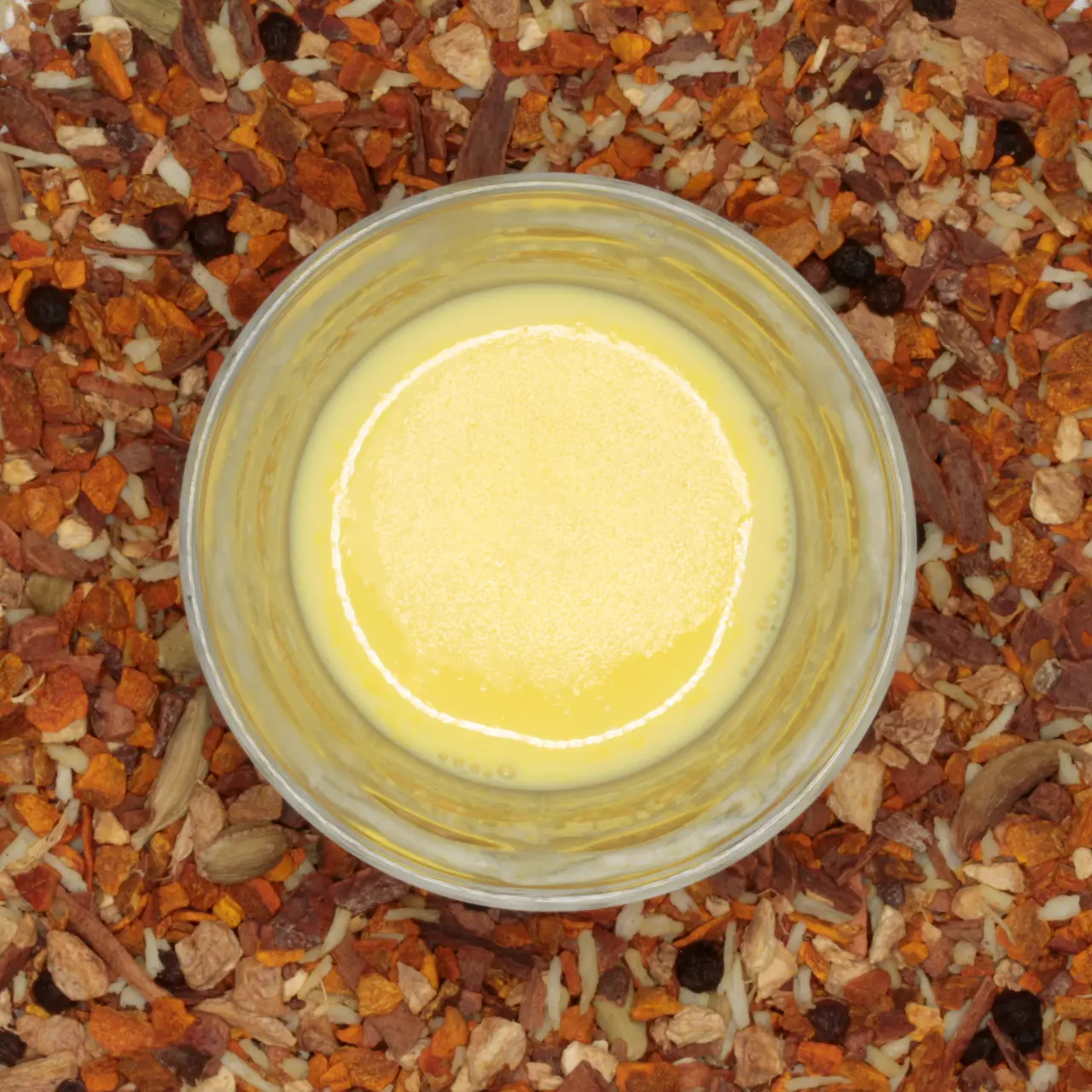 – Basisrecept Golden Milk: 15 g Golden Milk Spices samen met 0,5 L melk (of plantaardige alternatieven zoals amandelmelk, havermelk, sojamelk, kokosmelk) aan de kook brengen en dan 5-10 minuten zachtjes laten doorpruttelen. Door een zeefje in een potje, glas, kop, mok schenken.