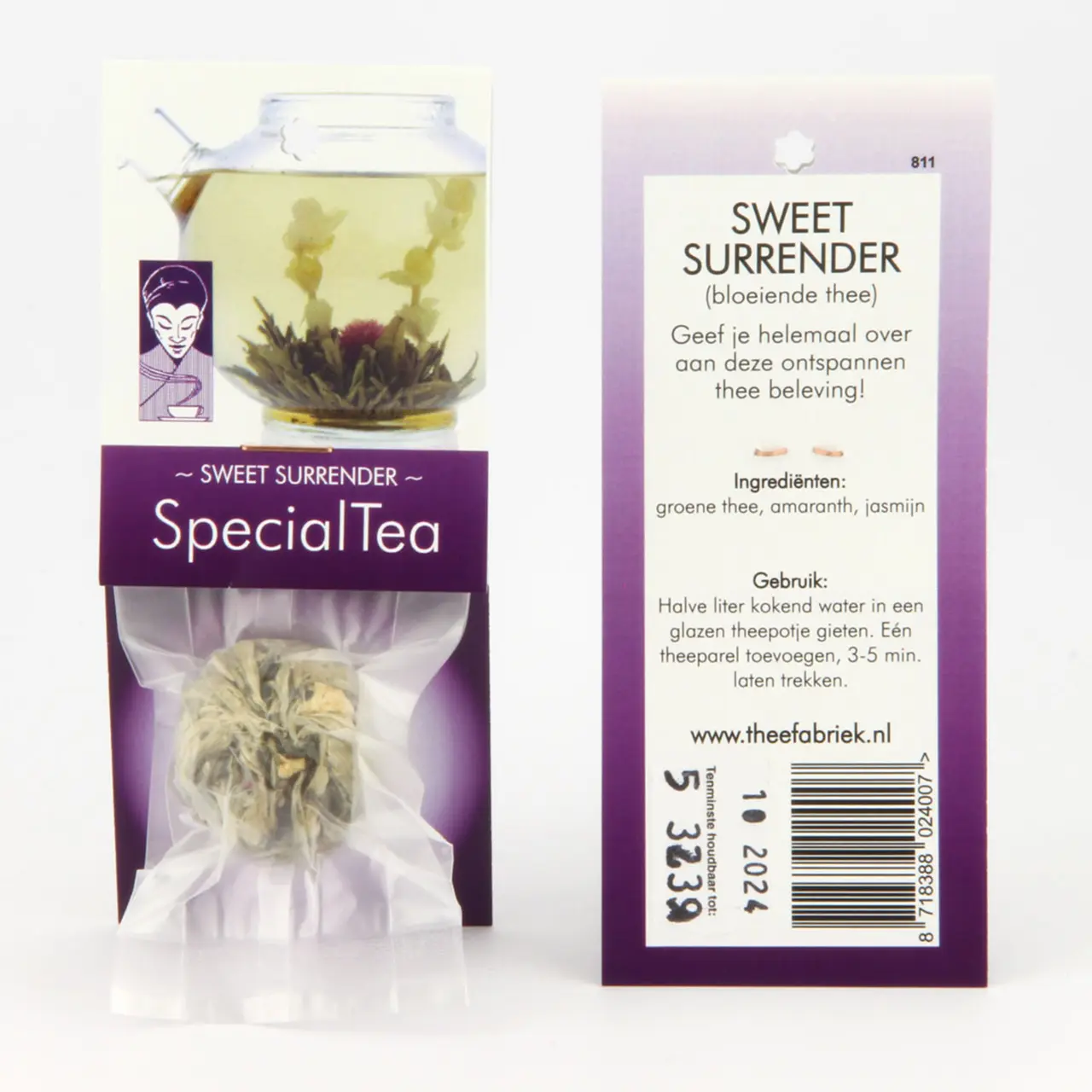 U kunt Sweet Surrender in kant-en-klare consumentenverpakkingen bij ons kopen, verpakt per stuk in een omslagkaartje in de huisstijl van De Theefabriek, in colli van 6 geleverd.