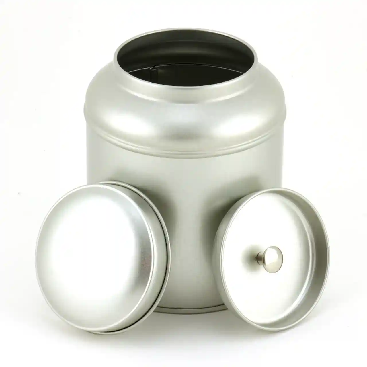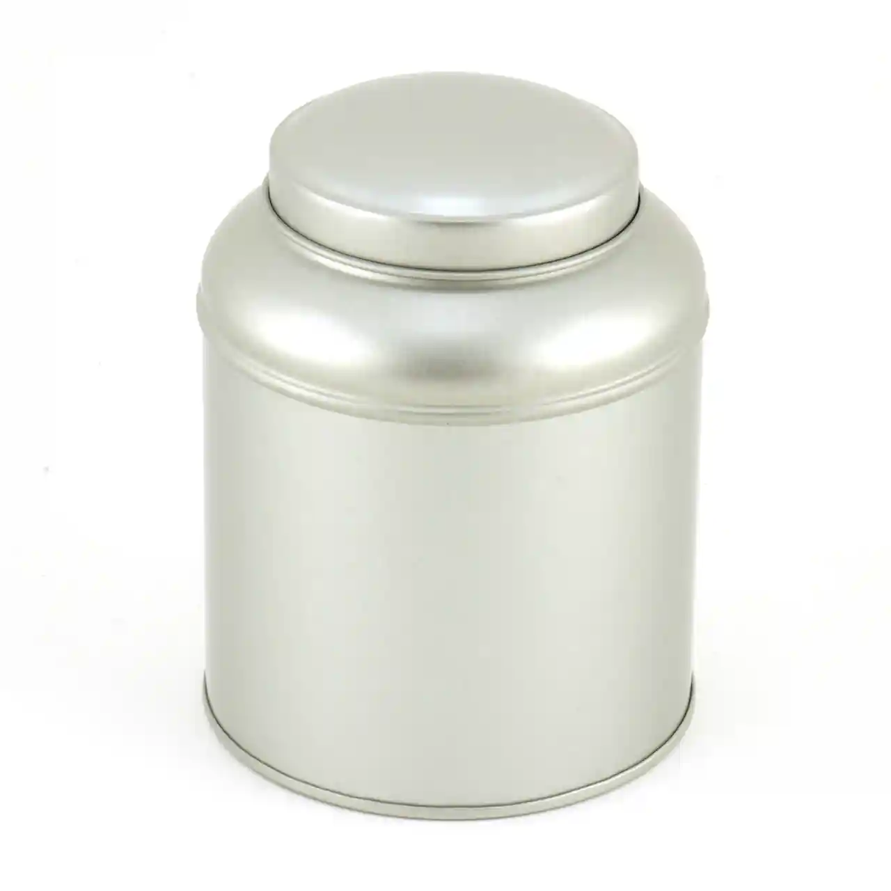Prachtige, matzilverkleurige, koepelvormige theeblikjes met deksel en binnendeksel, per 12 stuks verpakt.