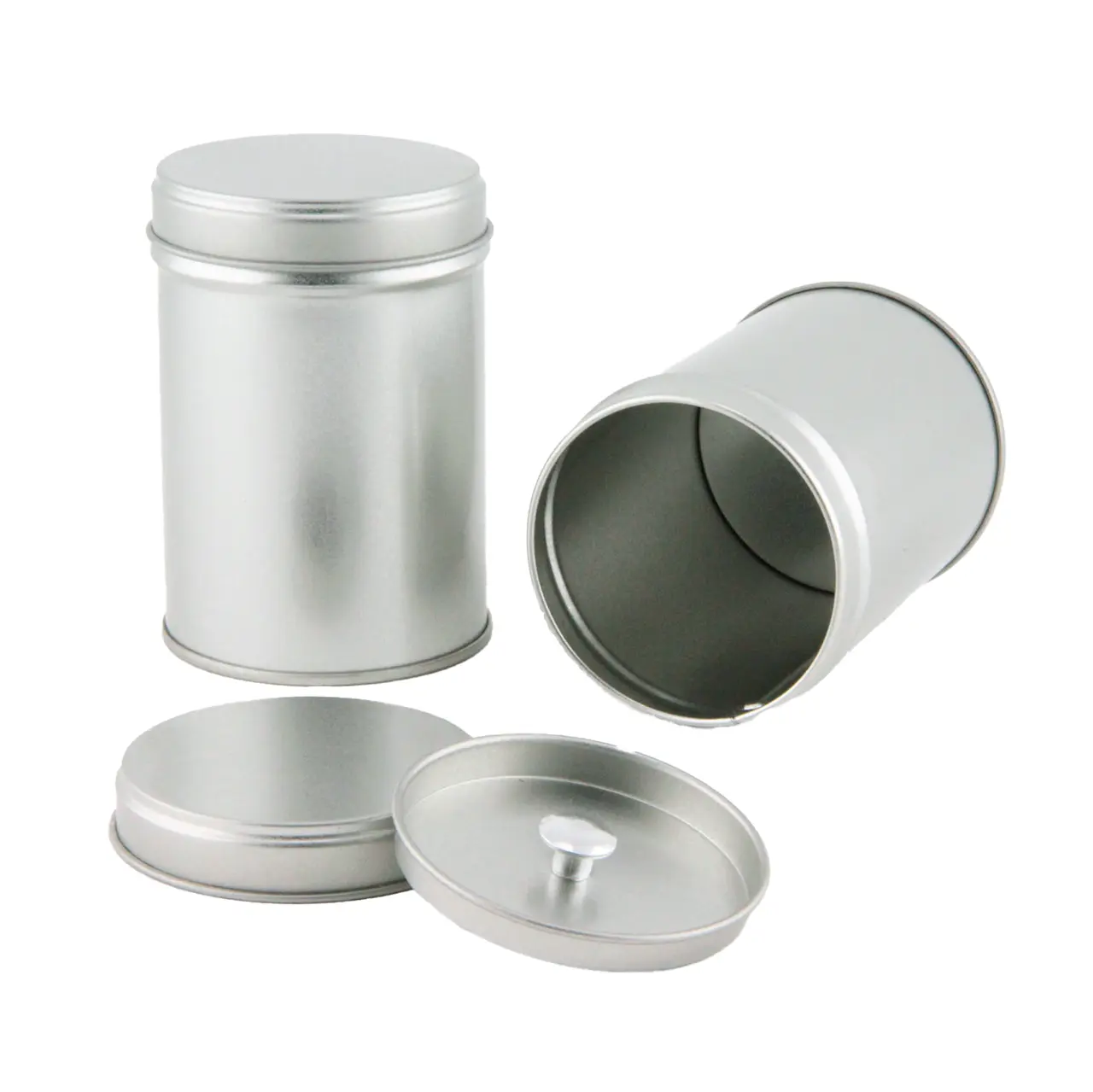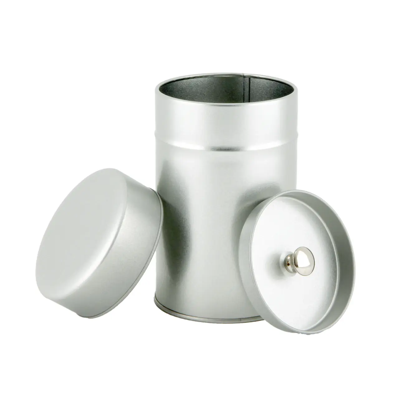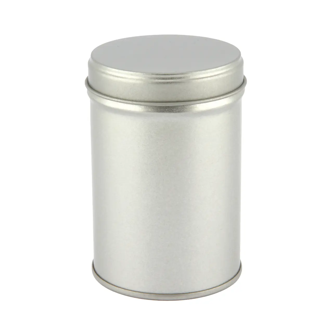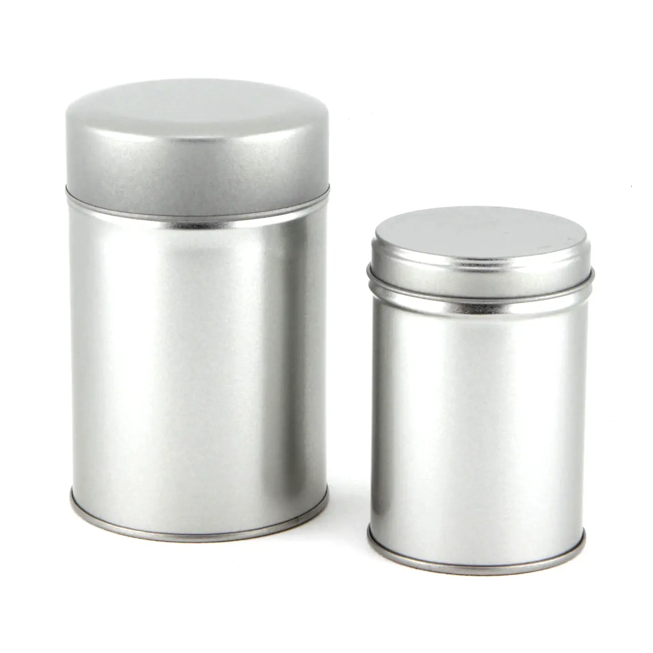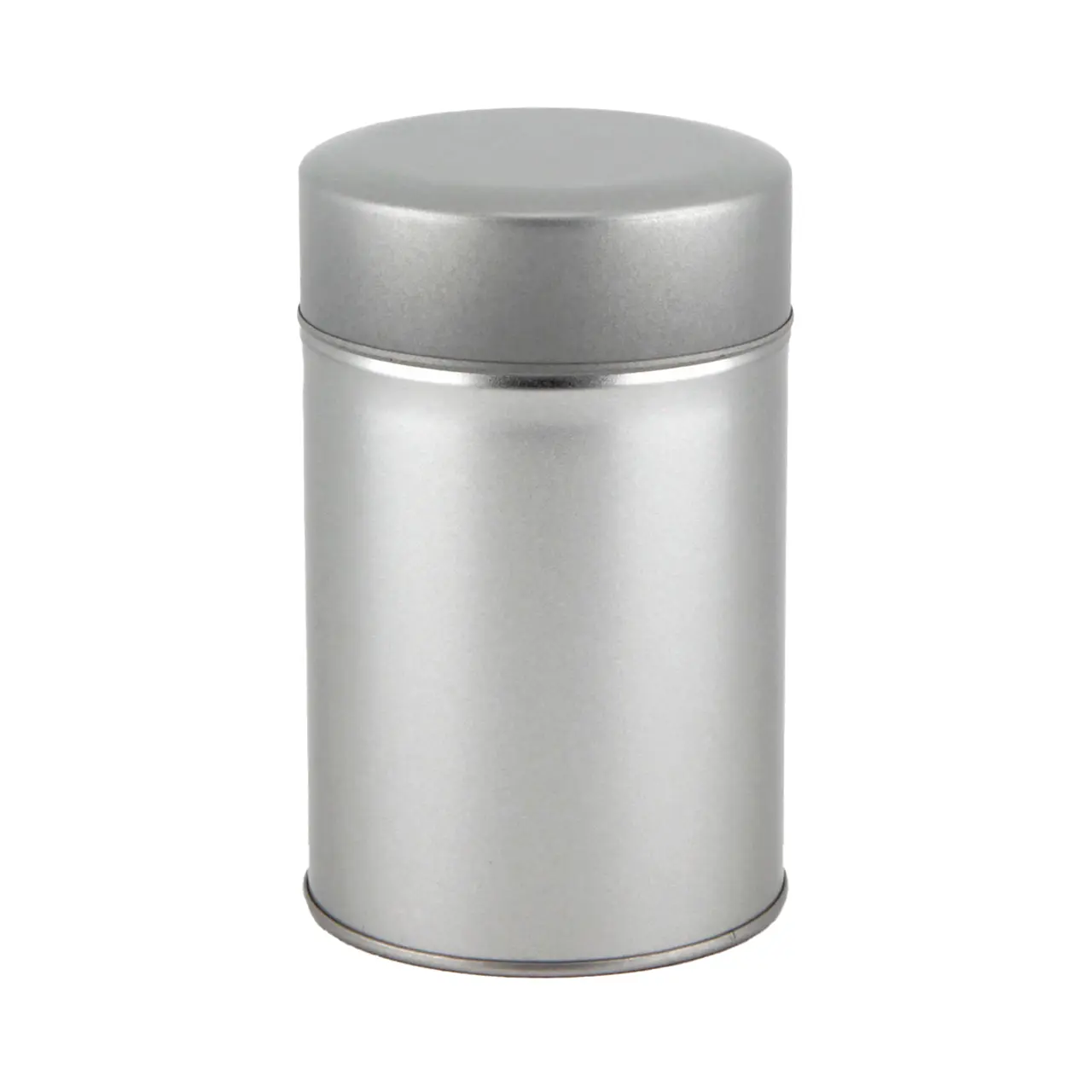 Prachtige, matzilverkleurige theeblikjes, mooi gemaakt, met binnendeksel, per 12 stuks verpakt.