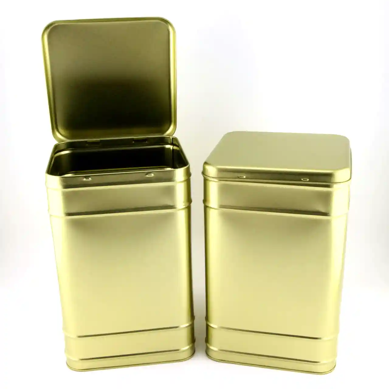 Prachtige, matgoudkleurige theewinkelblikken, mooi gemaakt, met scharnierdeksel, per 12 stuks verpakt.